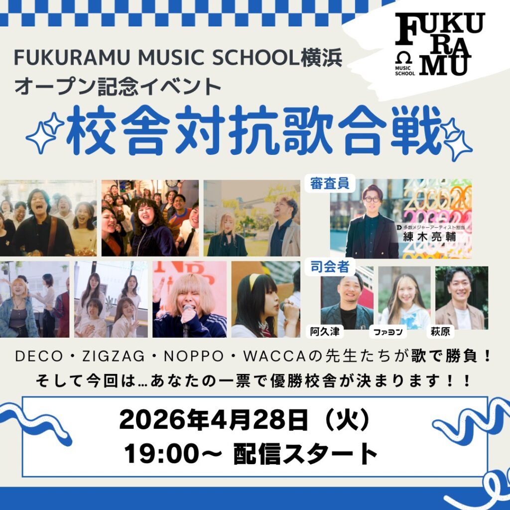 また、FUKURAMU MUSIC SCHOOLの開校を記念して、オープニングイベント「各校舎対抗歌合戦」を開催いたします。