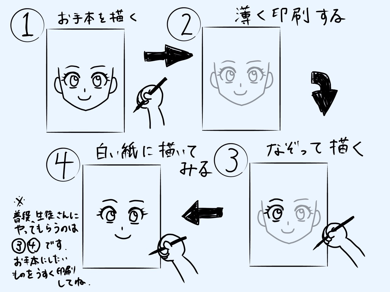 →3のステップのあと、すぐに白紙で再現してみると不思議なことに、さっきよりずっと自然に描けてるんです!