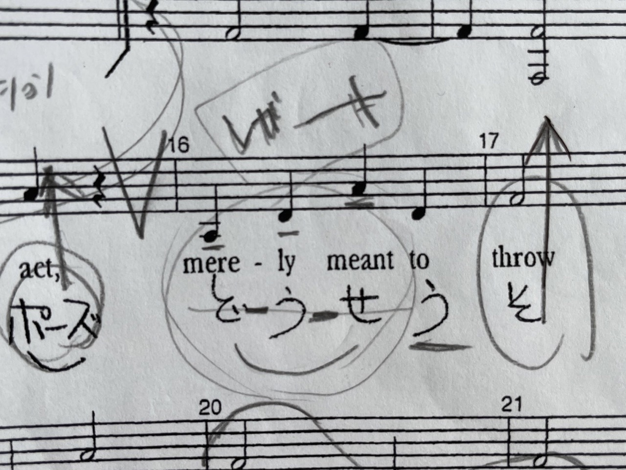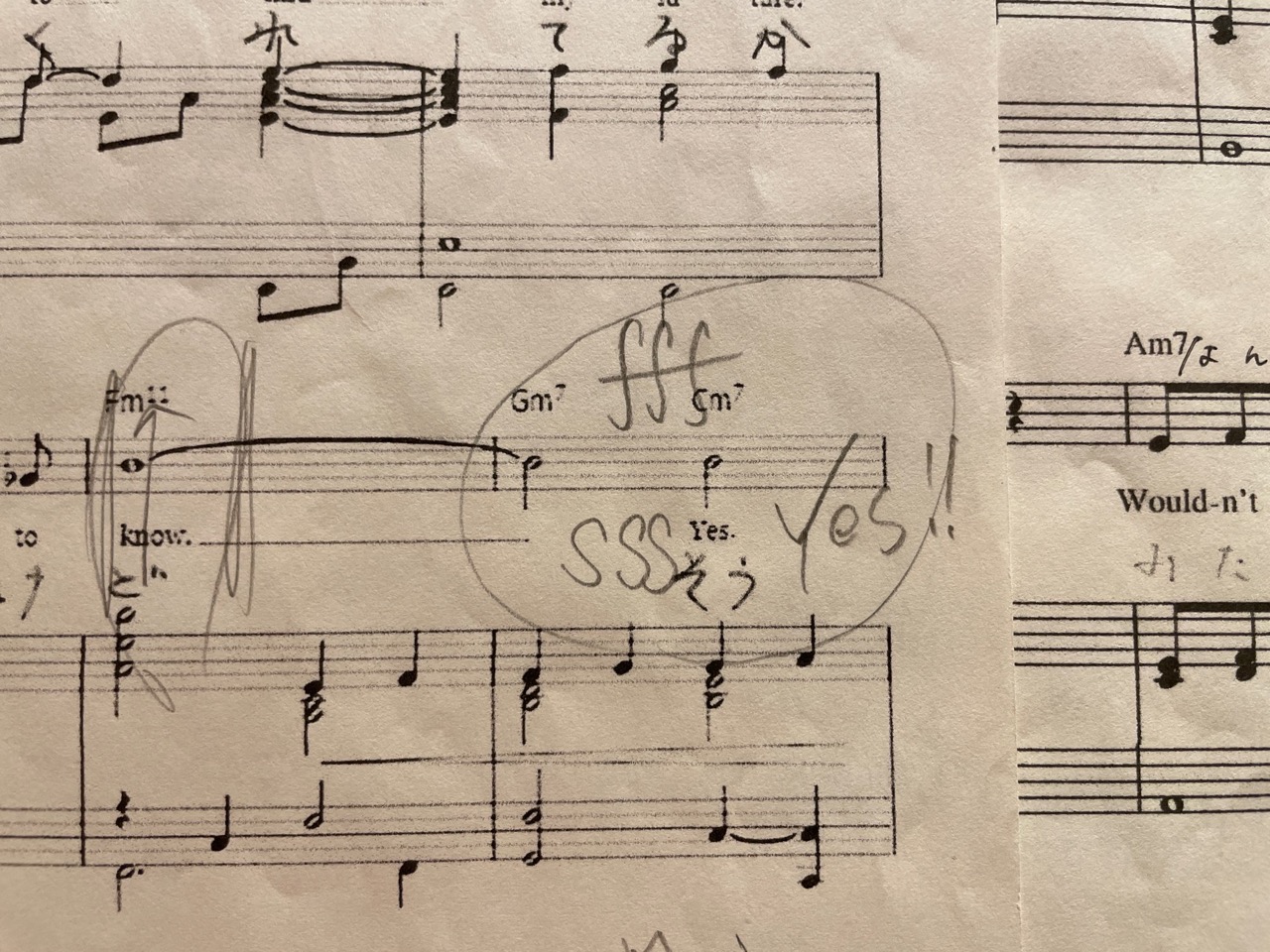 私はよく子音を立てたい場所では歌詞の上にSやNなどを書いて毎回忘れないように自分に注意を促します。
