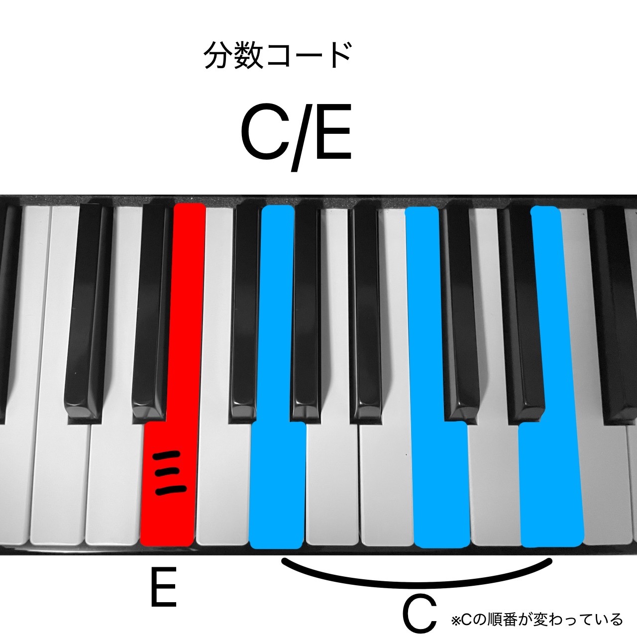 鍵盤で弾く時は、左手で分母の音、右手で分子のコードを弾くことが多いです。