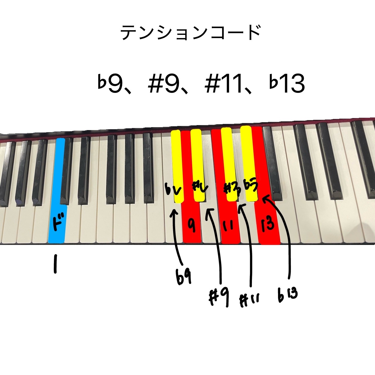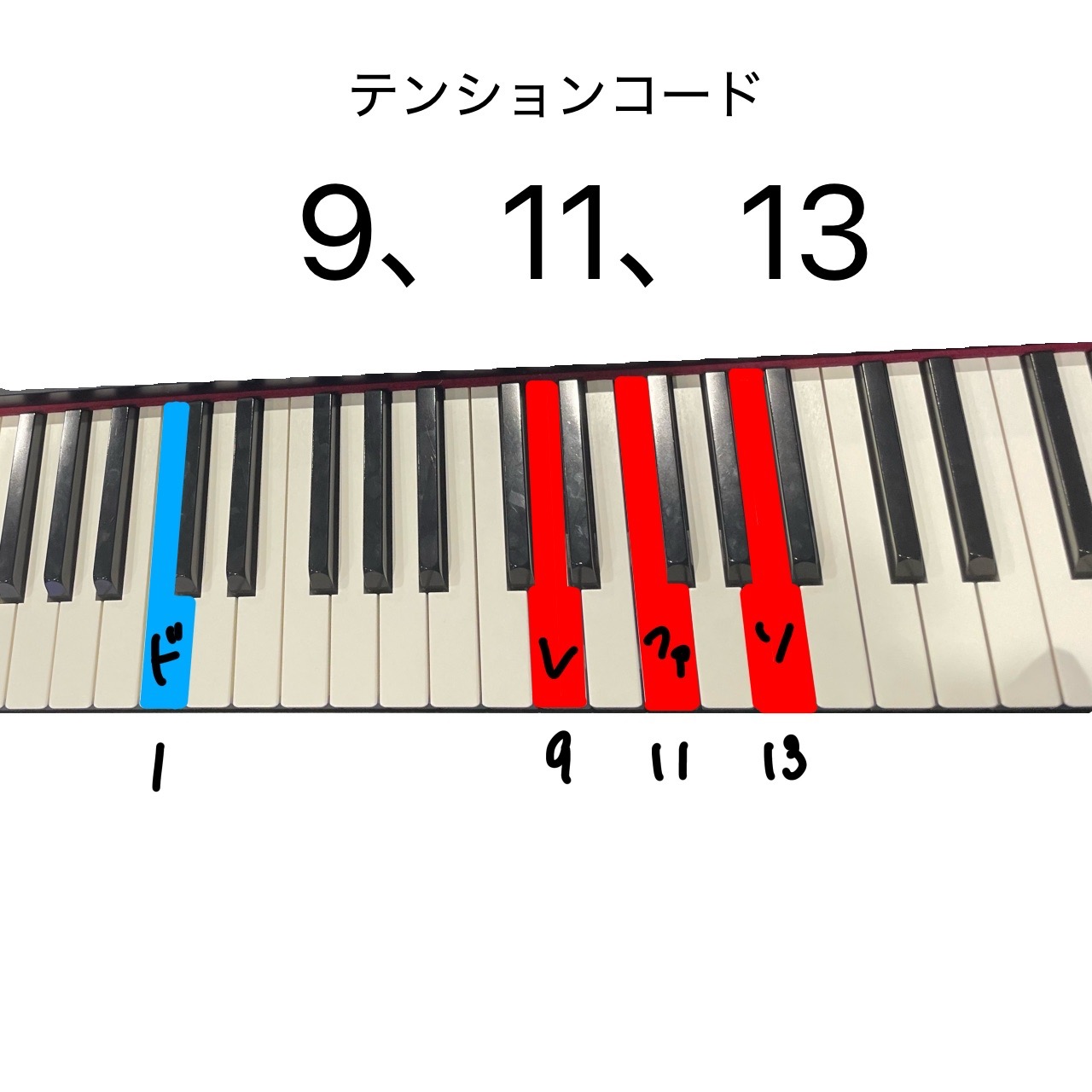 テンションコードは更にその先、9度、11度、13度の音を重ねるものになります。